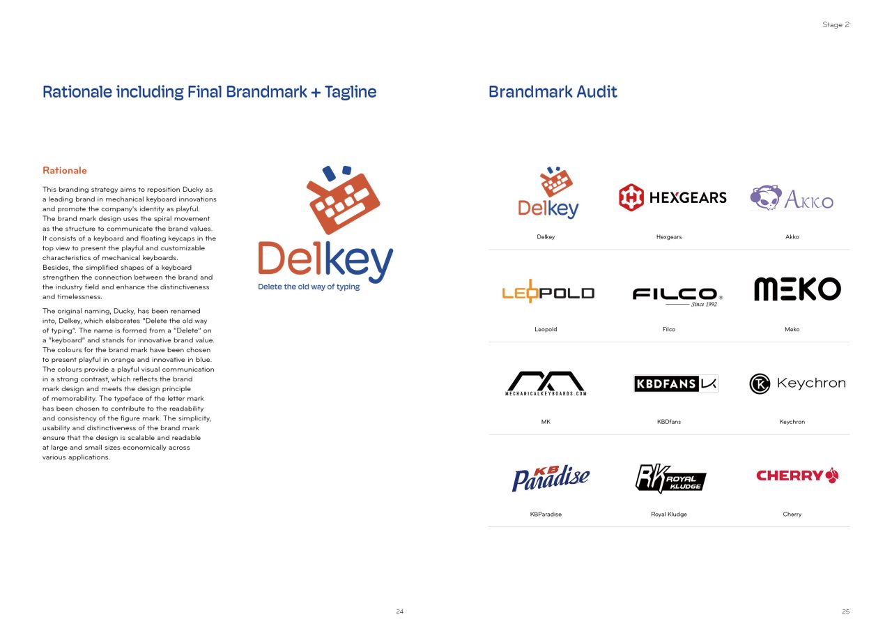 Delkey 機械鍵盤 品牌識別設計,聚焦於 Ducky 的品牌重塑,從原本偏向電競風格的 Logo 出發,重新打造「活潑且創新」的形象。透過全新命名 Delkey、橙藍配色與鍵盤元素設計,展現機械鍵盤的趣味性與專業度,強化品牌在遊戲、與辦公市場的辨識度與競爭力。